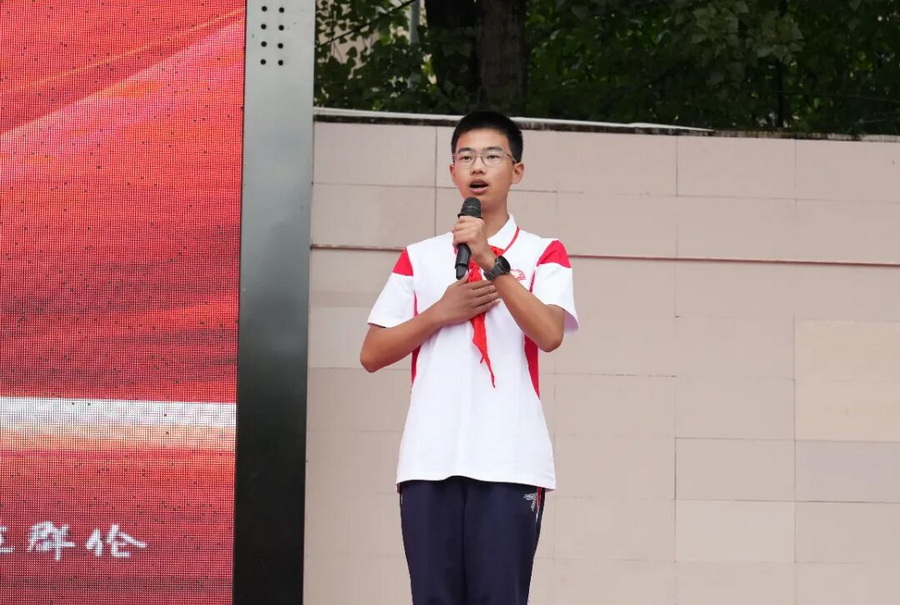 天环校区的刘梦瑶老师和刘喆老师与同学们一起演绎《感恩有你,山河无恙》。合唱团的孩子们用澄澈童声,将《如愿》的温情与《祖国不会忘记》的豪迈娓娓道来;“918”演讲比赛的优秀代表则字字铿锵,把英雄先辈的热血故事讲得直击人心;全场学子昂首挺胸,以震耳欲聋的声浪齐诵“山河为证,强国有我”,这一幕幕不仅是青春风采的绽放,更是七初师生传承红色基因的赤诚、勇担时代使命的决心。