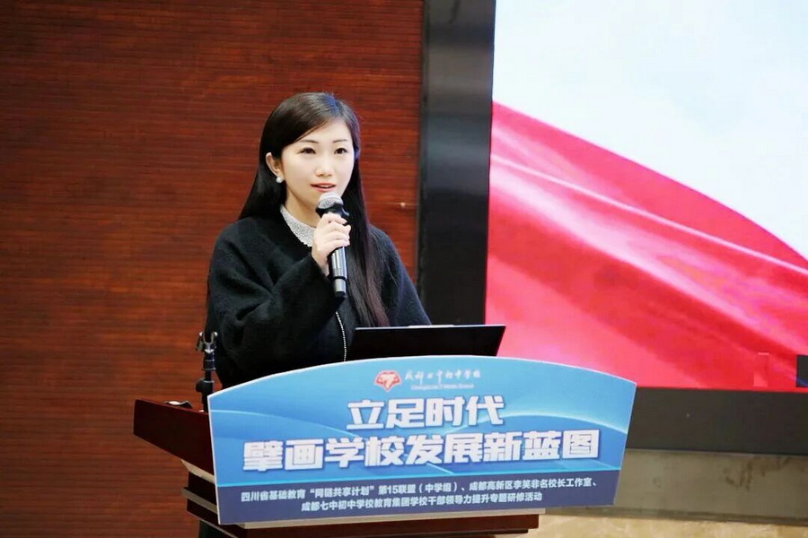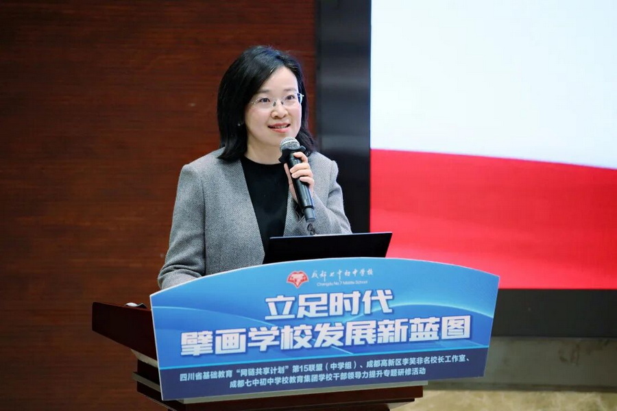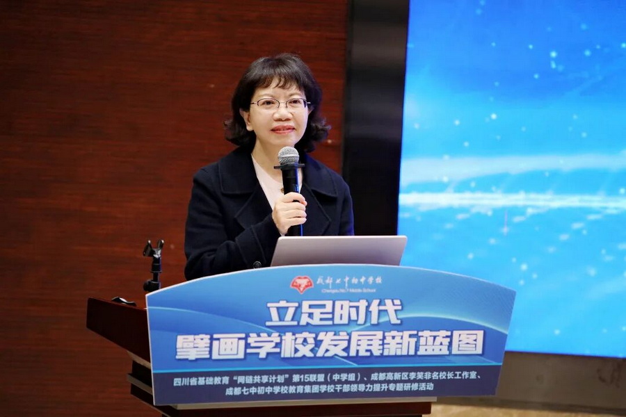 成都七中副校长、成都七中初中学校党委书记、成都七中初中学校教育集团总校长,成都高新区李笑非名校长工作室领衔人李笑非从时代要求、办学实践、未来路径三个维度,阐述了在教育强国建设背景和十五五开局之年,坚守育人初心,深化教育改革,培养担当民族复兴大任的时代新人。立足时代,她谈到保持好奇心和批判性思维非常重要,当前AI以指数级速度重塑世界,核心竞争力不在于通过AI找到答案,而在于善于提出问题。结合学校发展历程、办学理念与实践成果,李书记回顾了学校在育人道路上的探索与收获。李书记谈到,鉴往知新谋发展,锚定目标启新程,加快建设教育强国,我们必须坚持党对教育事业的全面领导,塑造立德树人新格局。我们要站高望远、与时俱进、面向未来。我们要在传承中创新,在推进学校第四个五年规划中,明晰三年行动计划,从形成新范式、开发新动能、培育新素养、打造新生态四个方向推进办学进一步提质增效。