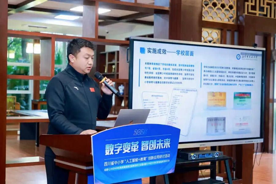 董桢老师分享了学校数字化体育教学的创新实践。董老师表示,学校通过构建“四大三巡”教学模式,运用智能手环和数字资源库,实现了体育教学的个性化和精准化。学校还建立课外运动生态系统,利用AR平台和智慧数据系统,推动学生体质健康提升,取得显著成效。