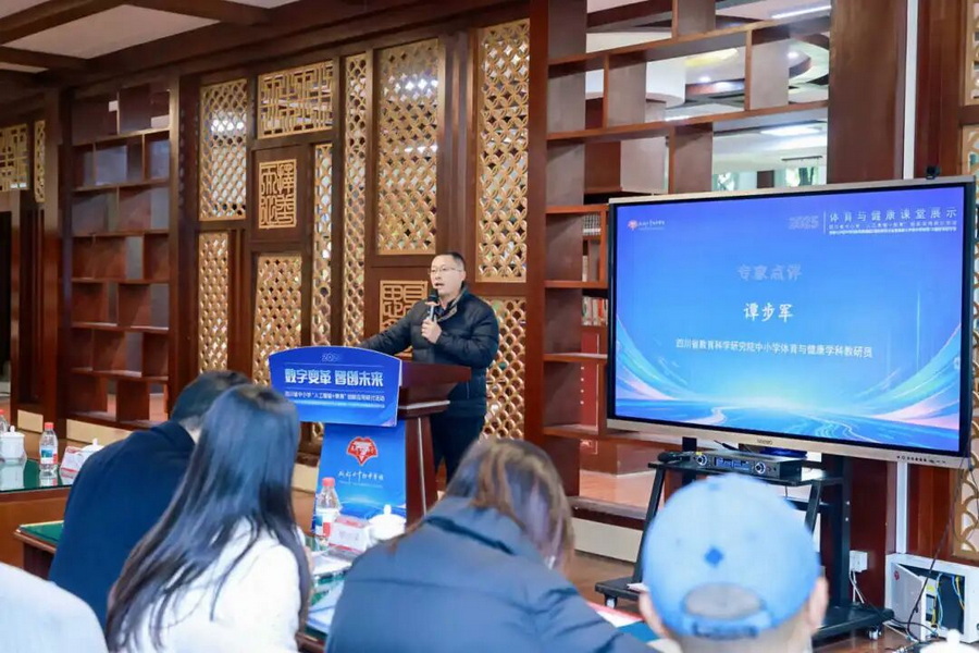 四川省教育科学研究院体育教研员谭步军进行点评。谭步军老师高度肯定本次研讨会的精彩呈现,并给出改进意见和建议:纵向上,依托AI采集运动负荷等数据生成雷达图;横向上,融合教师观察形成技术、体能、心理三维模型,构建“数据驱动-智能评价-素养落地”新样态。针对技术依赖问题,他强调AI应服务于教学本质,如通过动作慢放解析发力链,突出“动作质量比数量更重要”的神经肌肉控制力训练路径。他指出,现代体育教育需破解传统教学痛点,通过智慧设备实现精准评价,建议建立家校社协同平台,将教育政策转化为可操作的数字化方案。